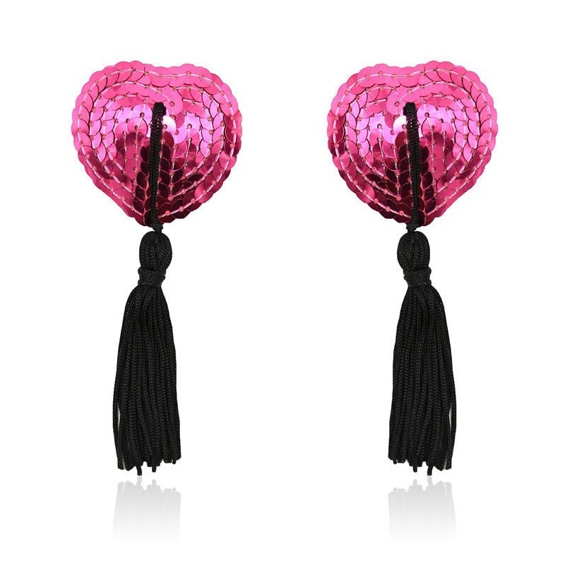 rivestiti in pailettes rosa fuchsia con frange nere.